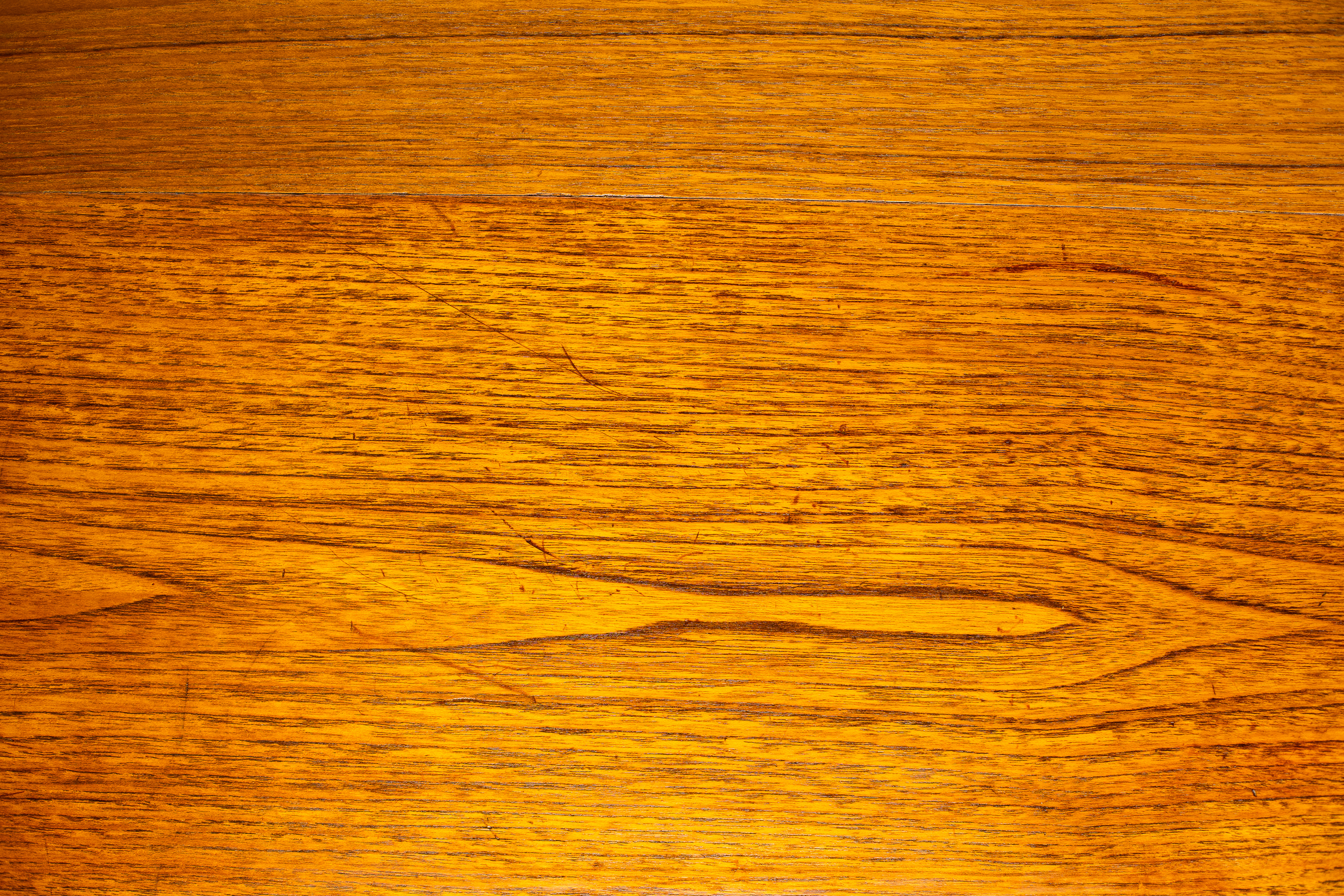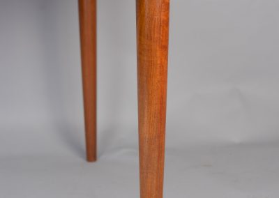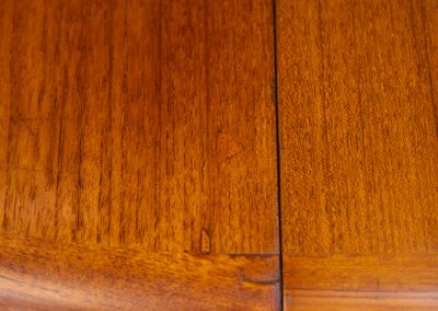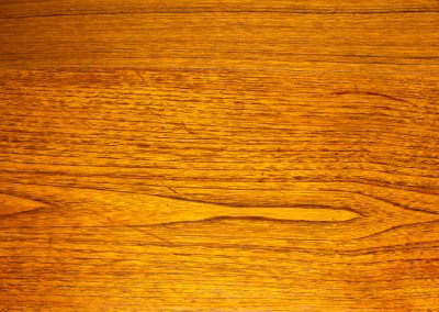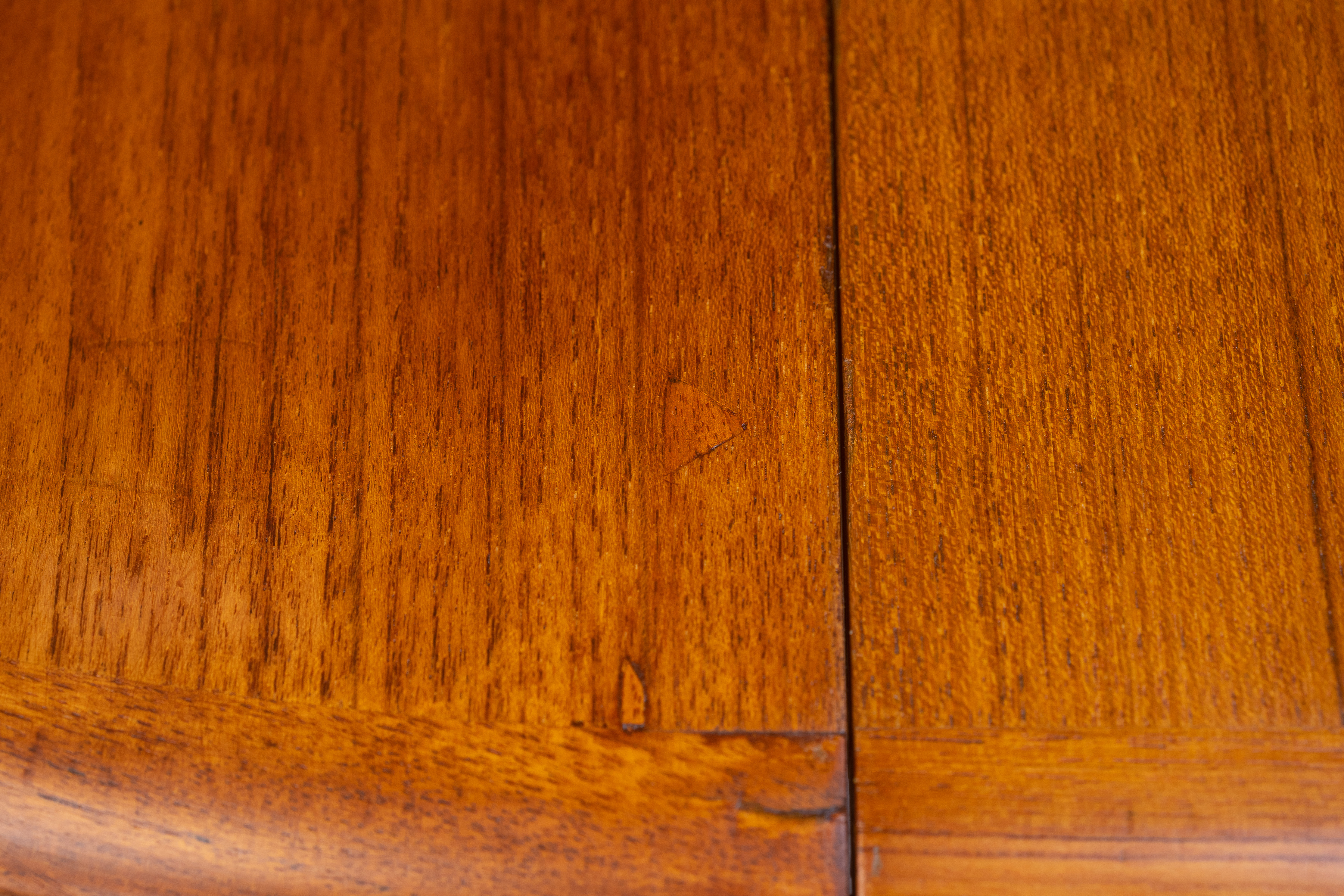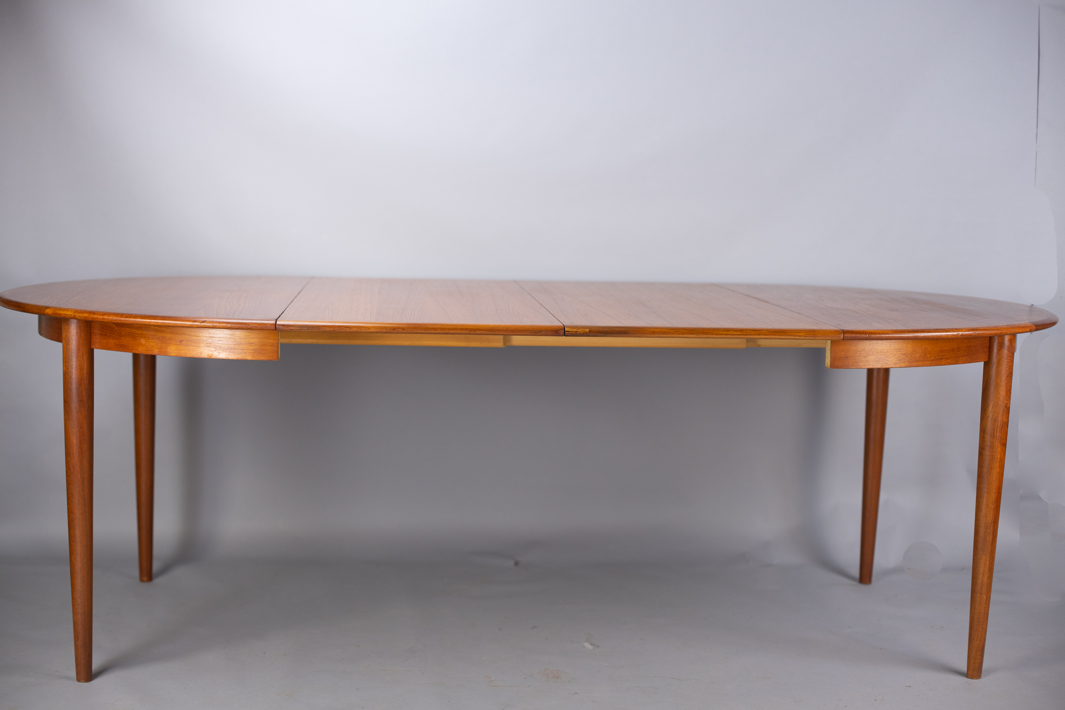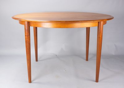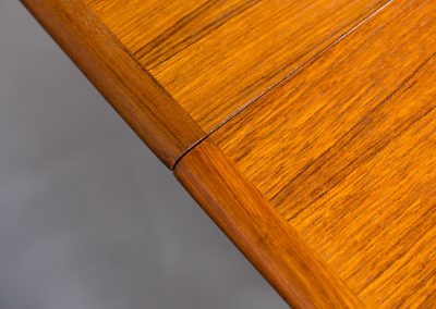 Beautifully patinated oiled teak finish. Simple minimalist lines with tapered edge detail. Good colour match between main table and extension leaves. There are some light scratches and marks on the surface as to be expected from half a century of use; a small triangular veneer repair; small inset repair on corner of extension. Please see photos for these details, none of which detracts from the overall impression of this elegant dining table.