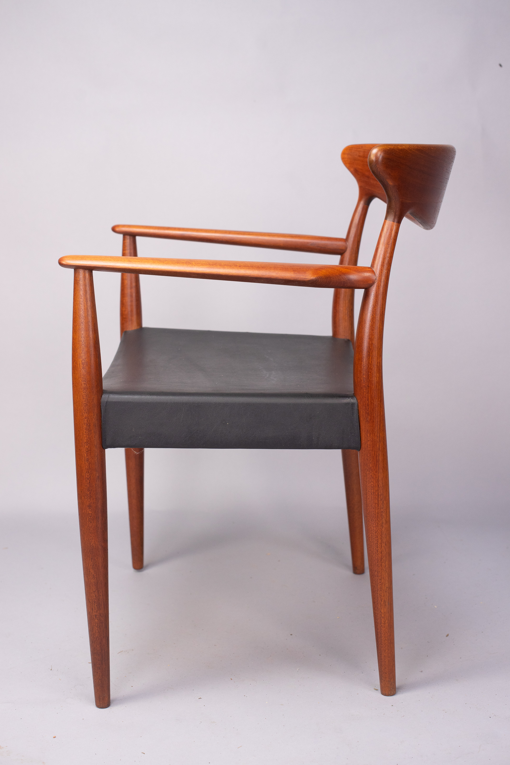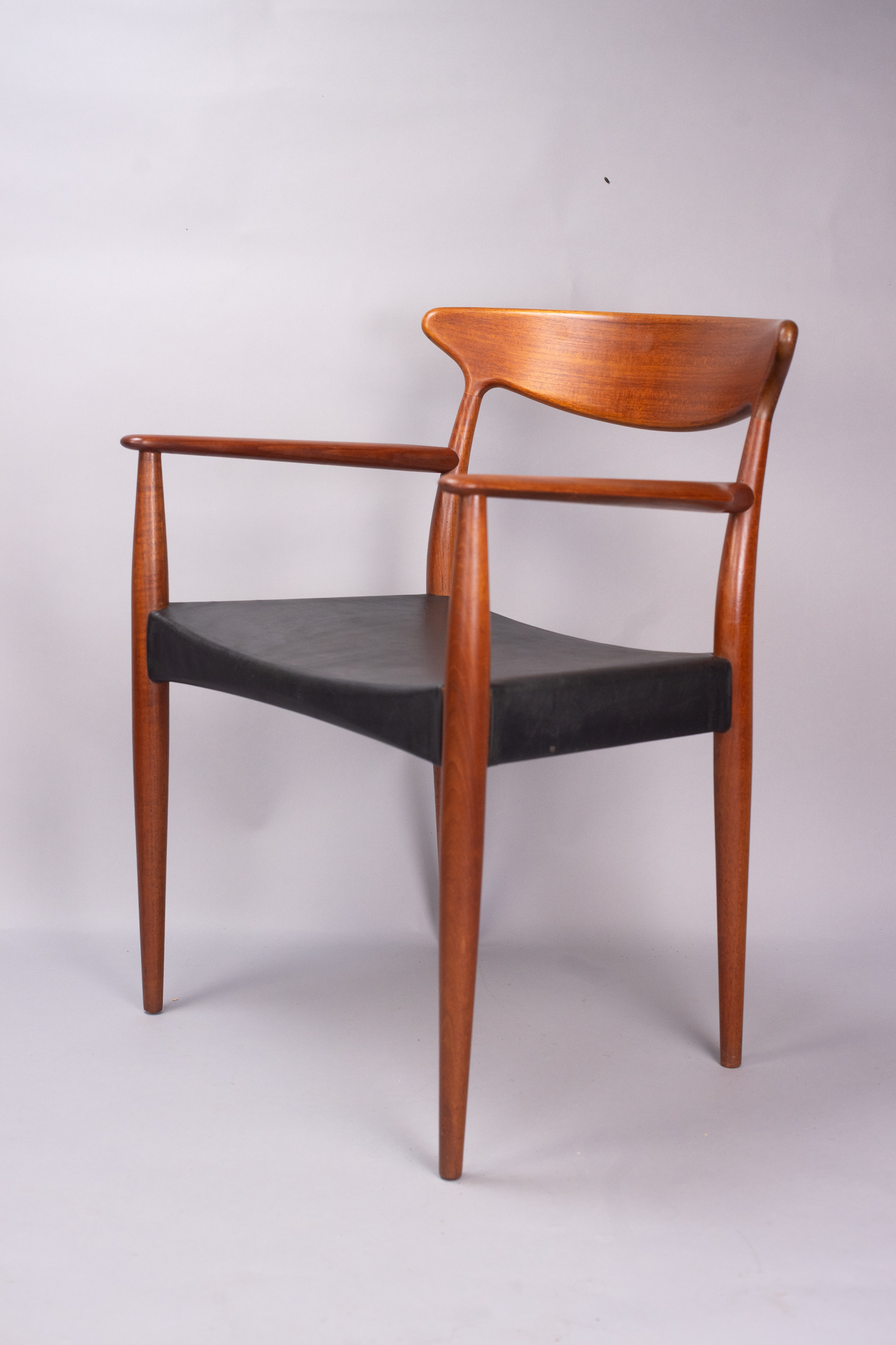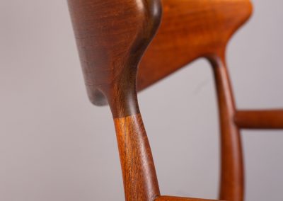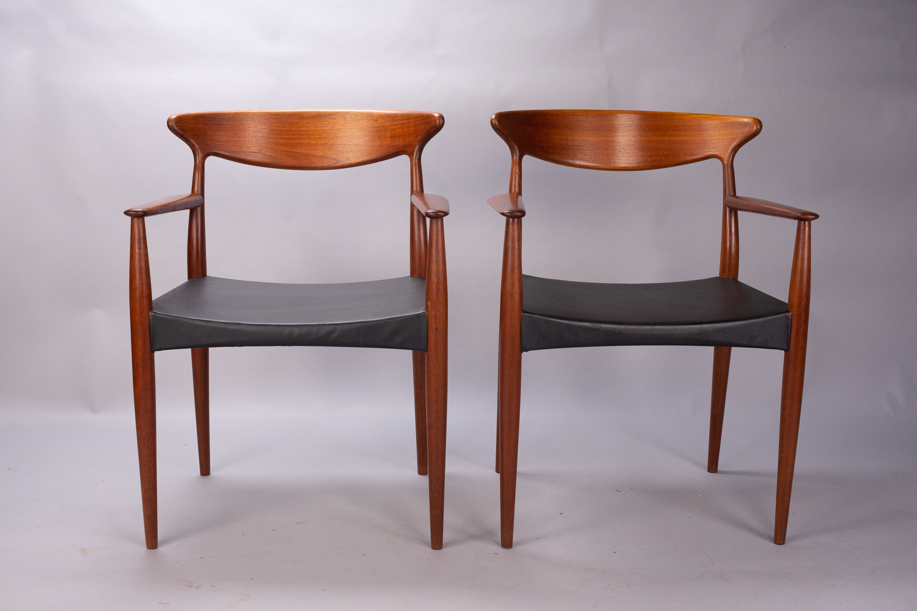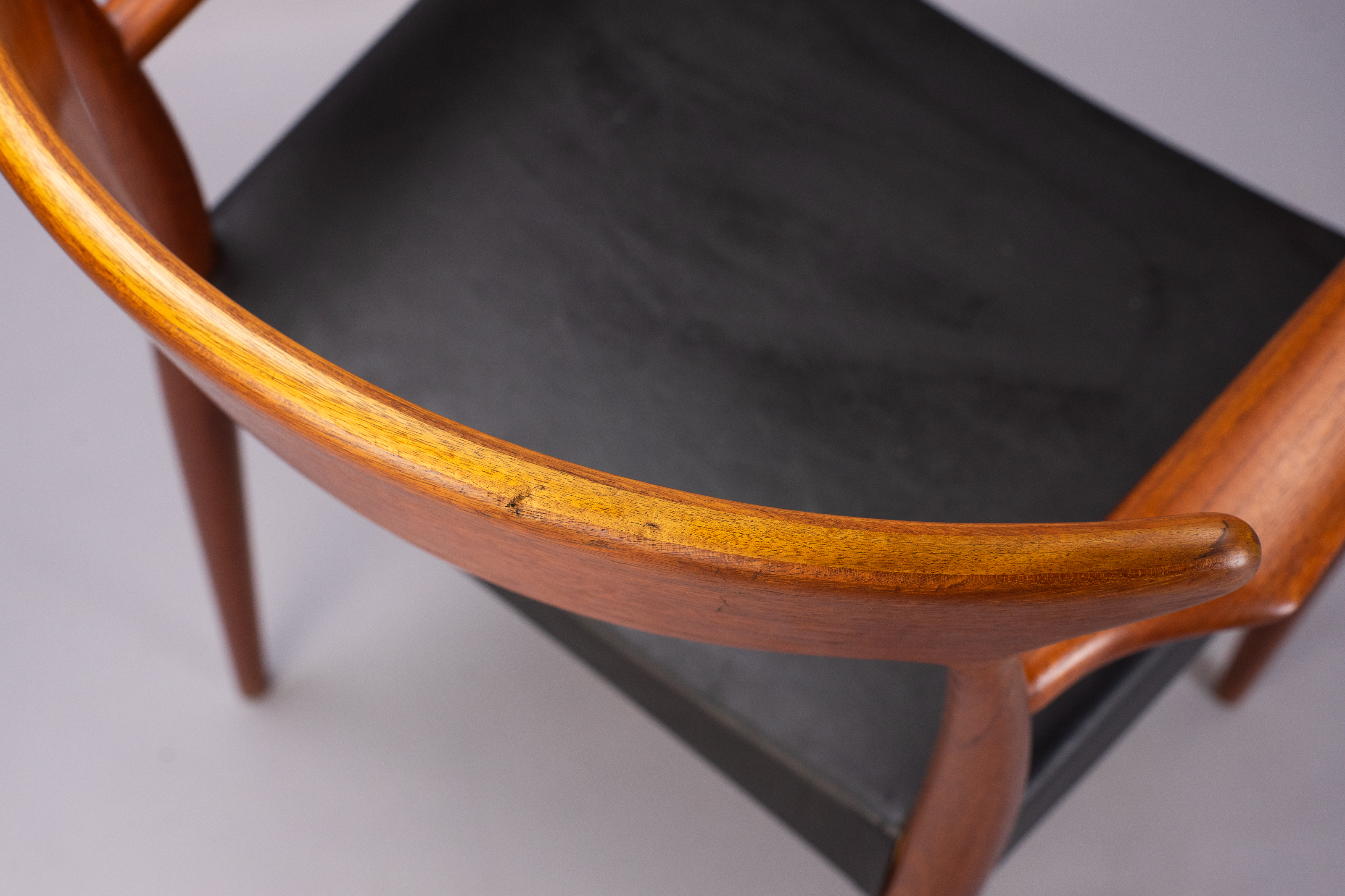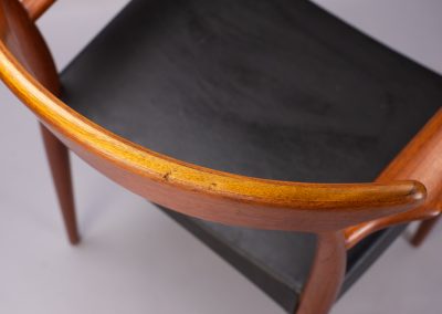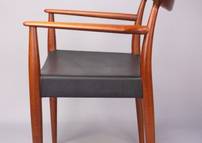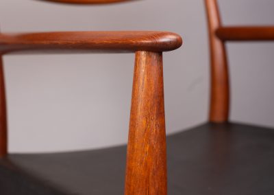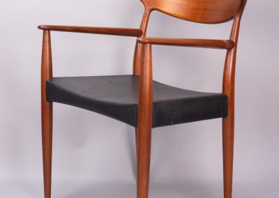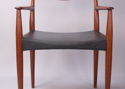 Solid teak frames with a wide, sweeping ‘cow-horn’ backrest formed from laminated teak and beechwood. The concave seats are a typical feature of the designer and have a covering of black vinyl faux-leather over a plywood seat.
