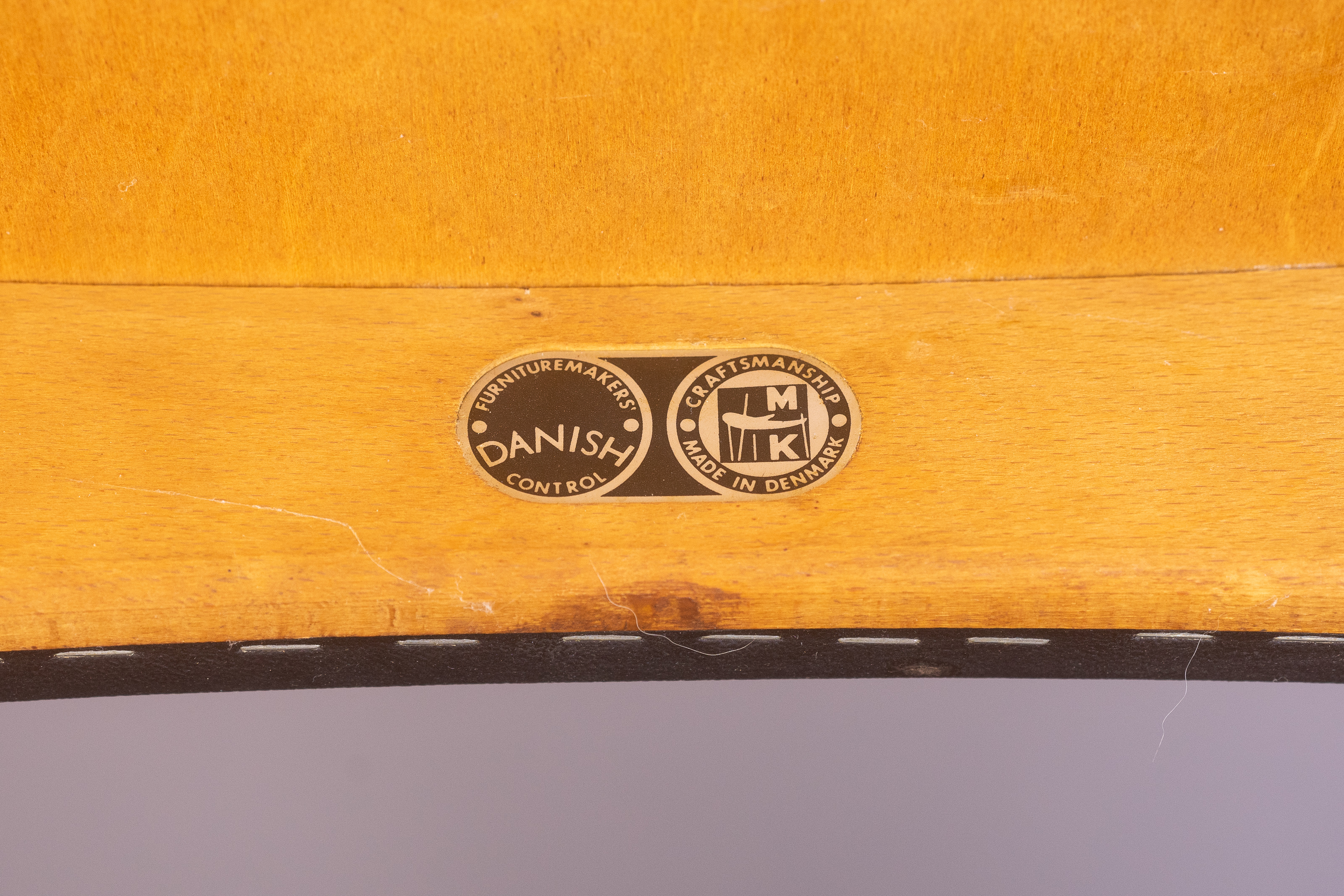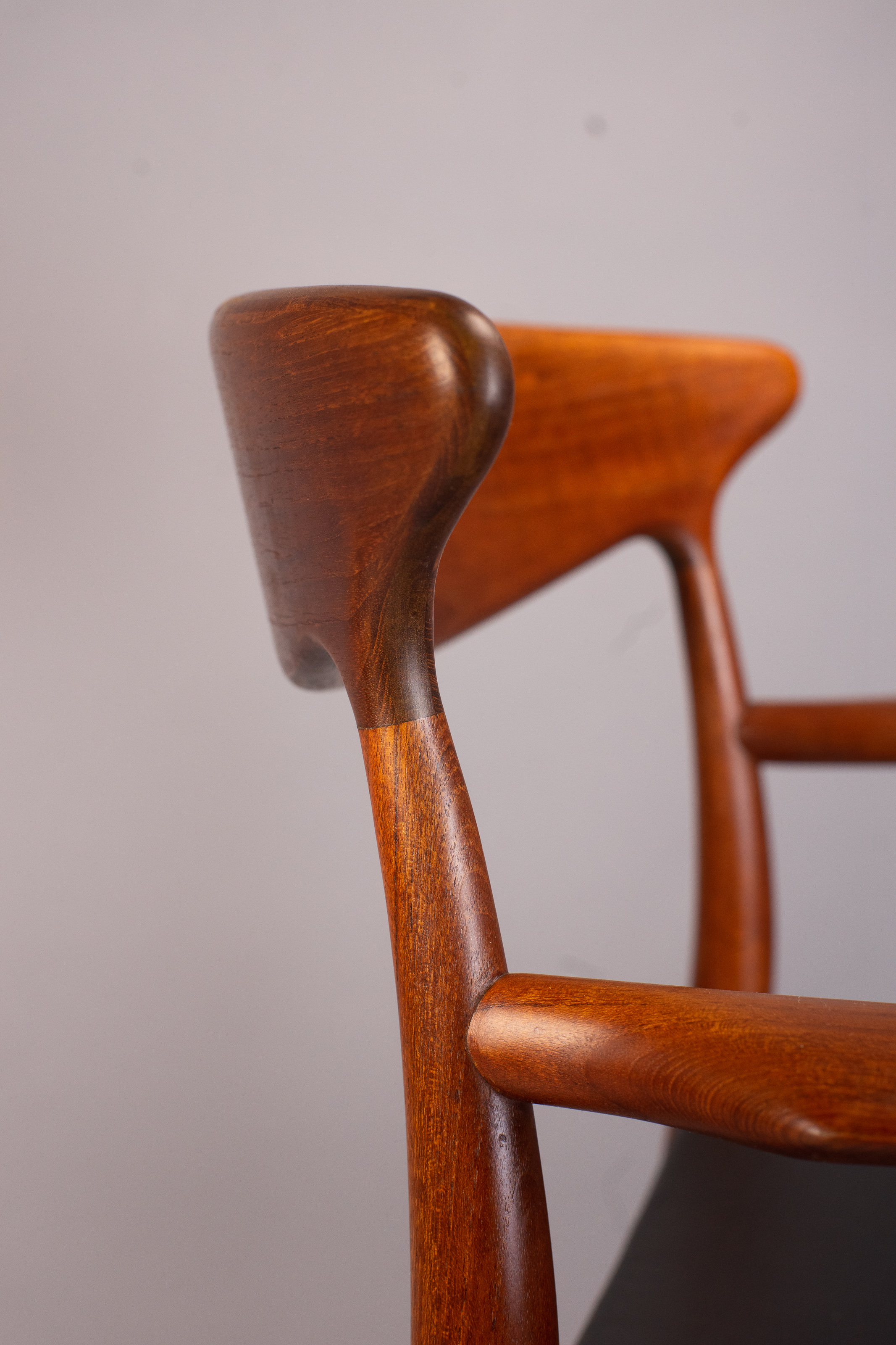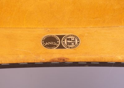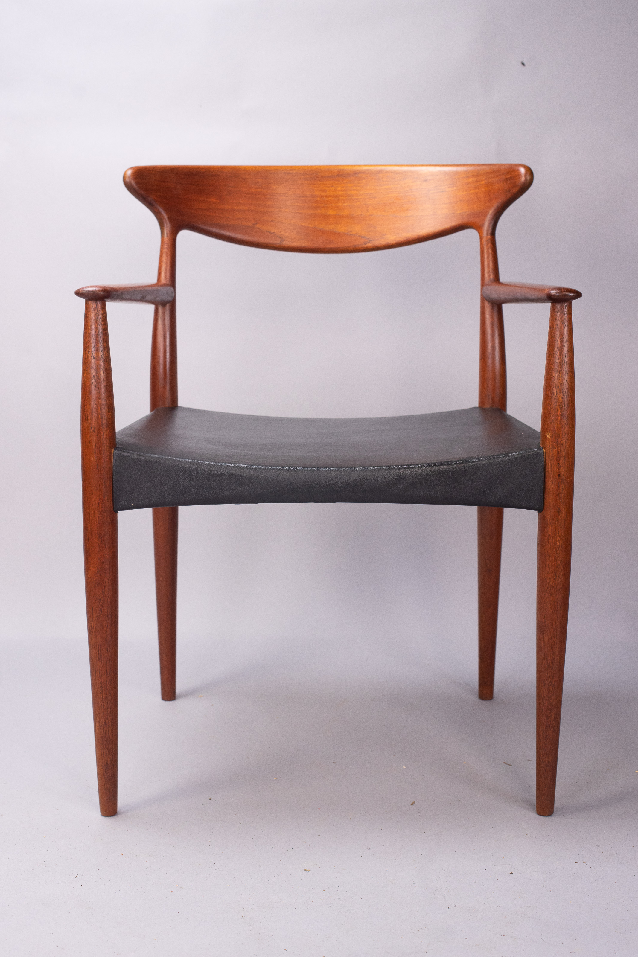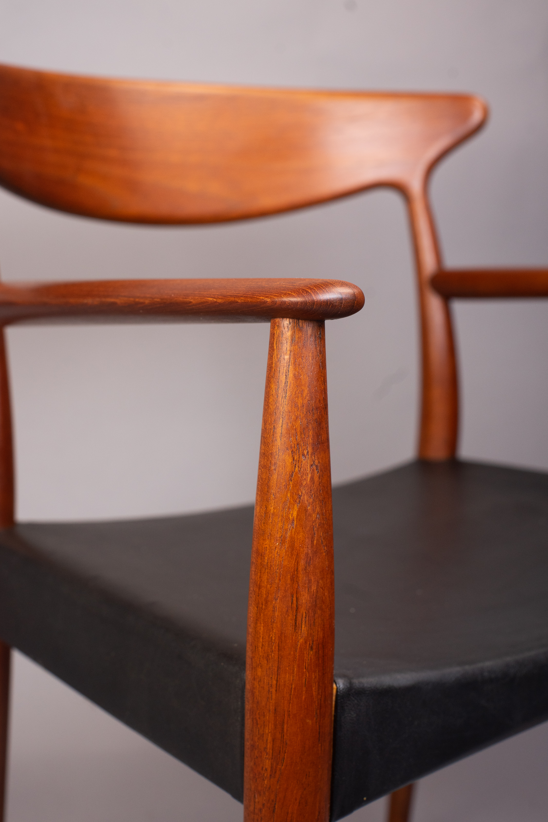 Solid teak frames with a wide, sweeping ‘cow-horn’ backrest formed from laminated teak and beechwood. The concave seats are a typical feature of the designer and have a covering of black vinyl faux-leather over a plywood seat.
