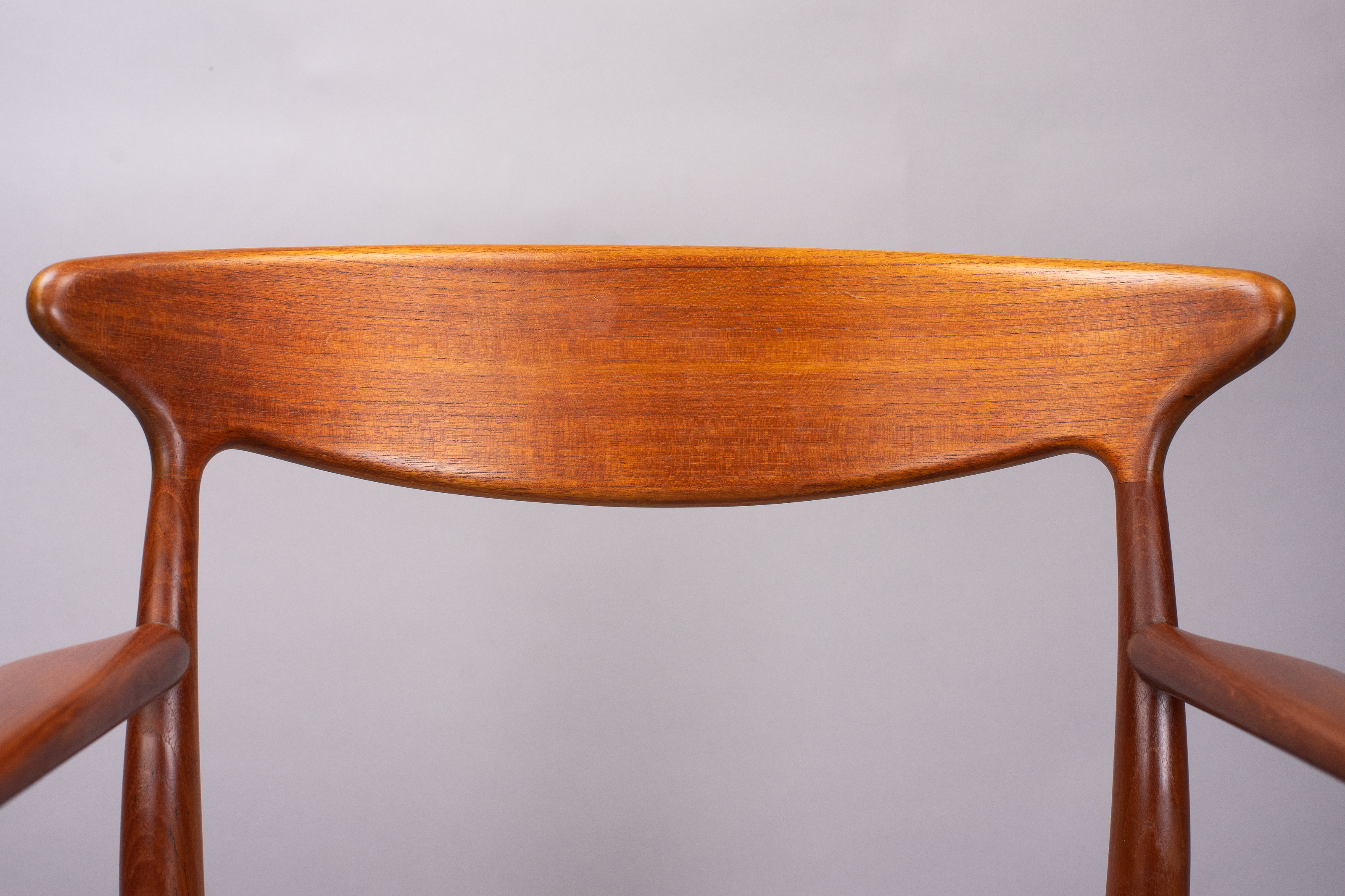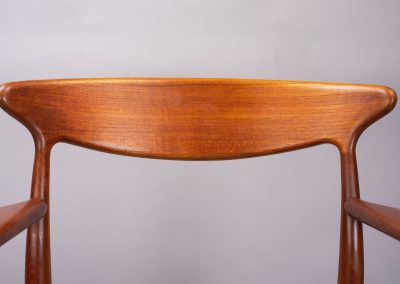 A pair of generously proportioned teak carver dining chairs with arms. Designed by Arne Hovmand Olsen for Mogens Kold, Denmark 1960s.