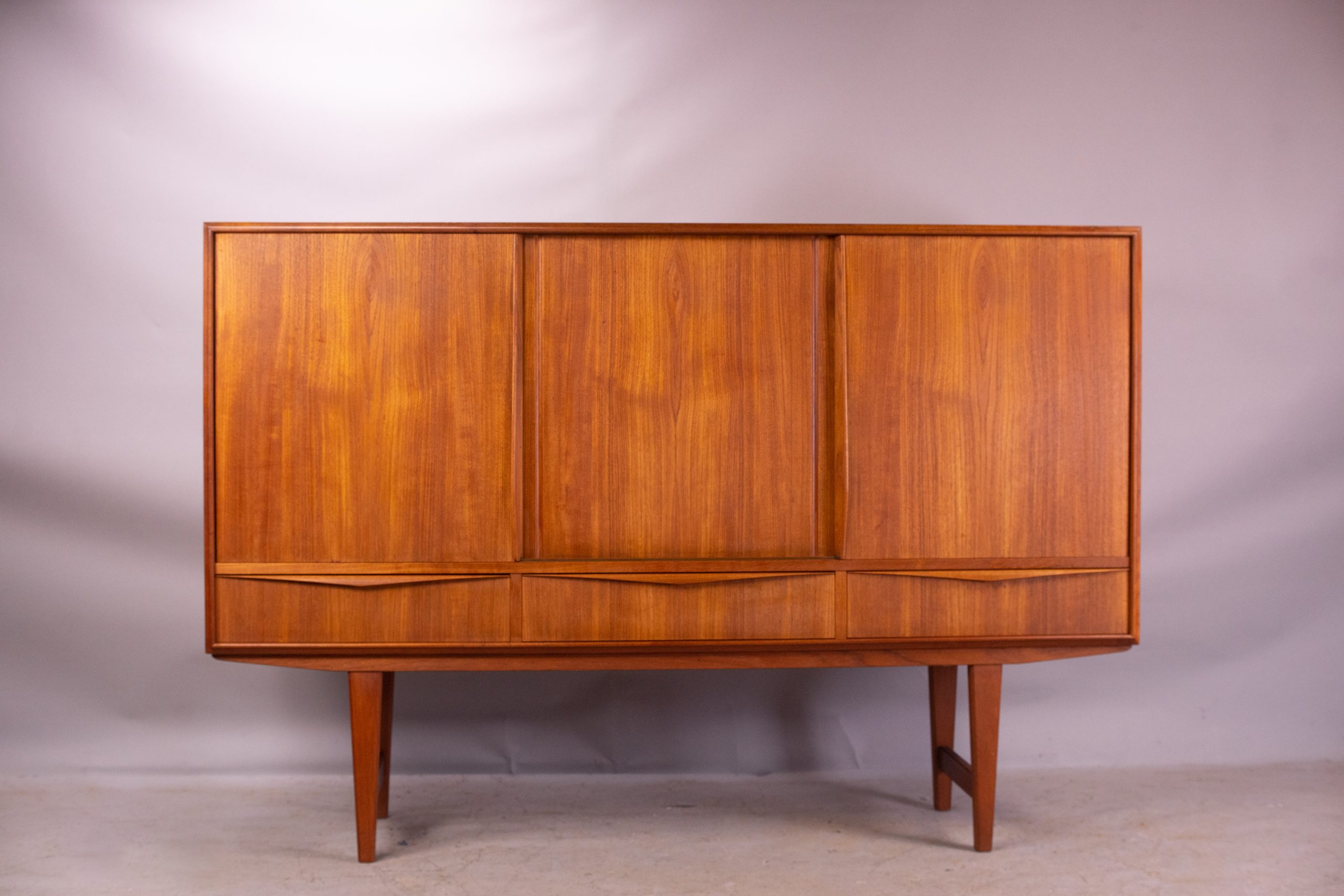 High sideboard designed by EW Bach for Sejling Skabe, Denmark. The outer sliding doors have organically-shaped carved teak handles running the length of one side and the inner door has two simple grooves allowing it to be moved behind the others. The right hand cupboard is fitted with two shallow drawers lined with green baize; the centre and left-hand cupboards have adjustable teak shelves. Underneath the cupboards there are three drawers with delicately formed chevron handles.