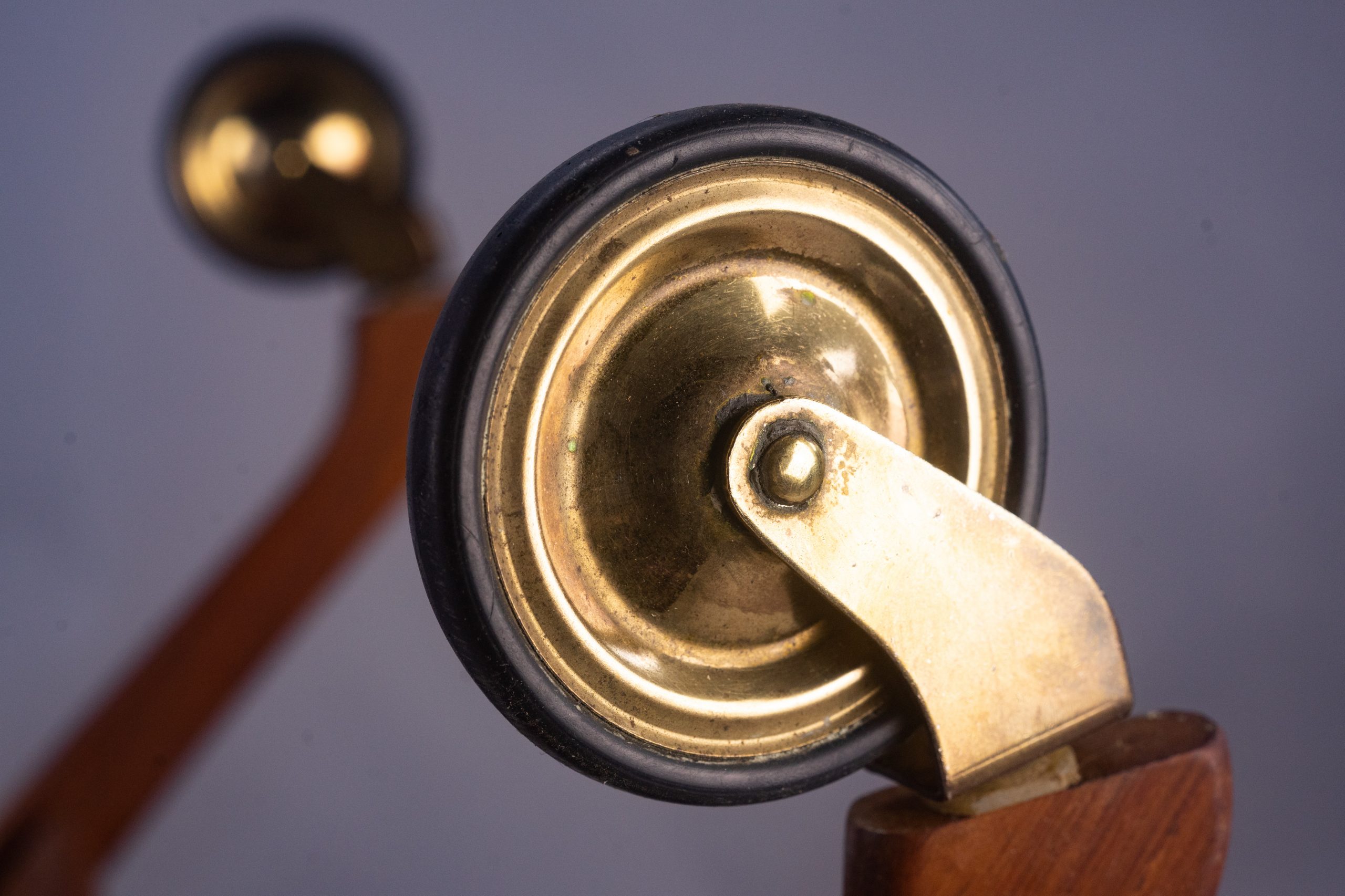 from solid teak with rubber-wheeled brass castors. Folds flat when not in use.