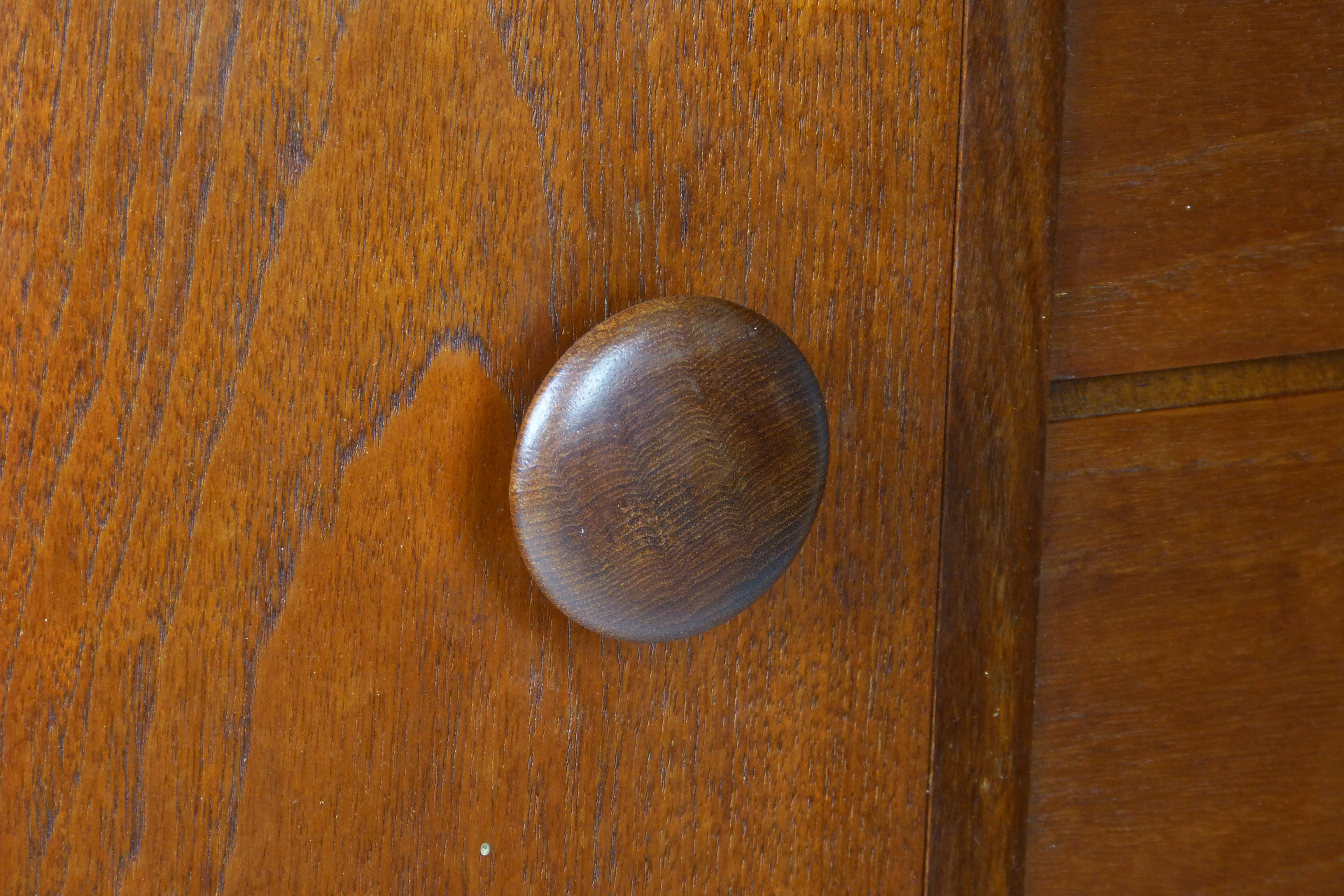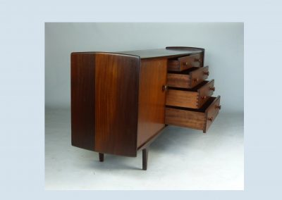 Simple, elegantly sweeping mid-century lines with a bow-fronted top and distinctive large button-shaped handles.