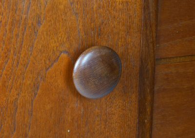 Cupboards with adjustable shelves set either side of four graduated drawers – the upper drawer is baize-lined with dividers for cutlery. The baize shows some signs of wear.